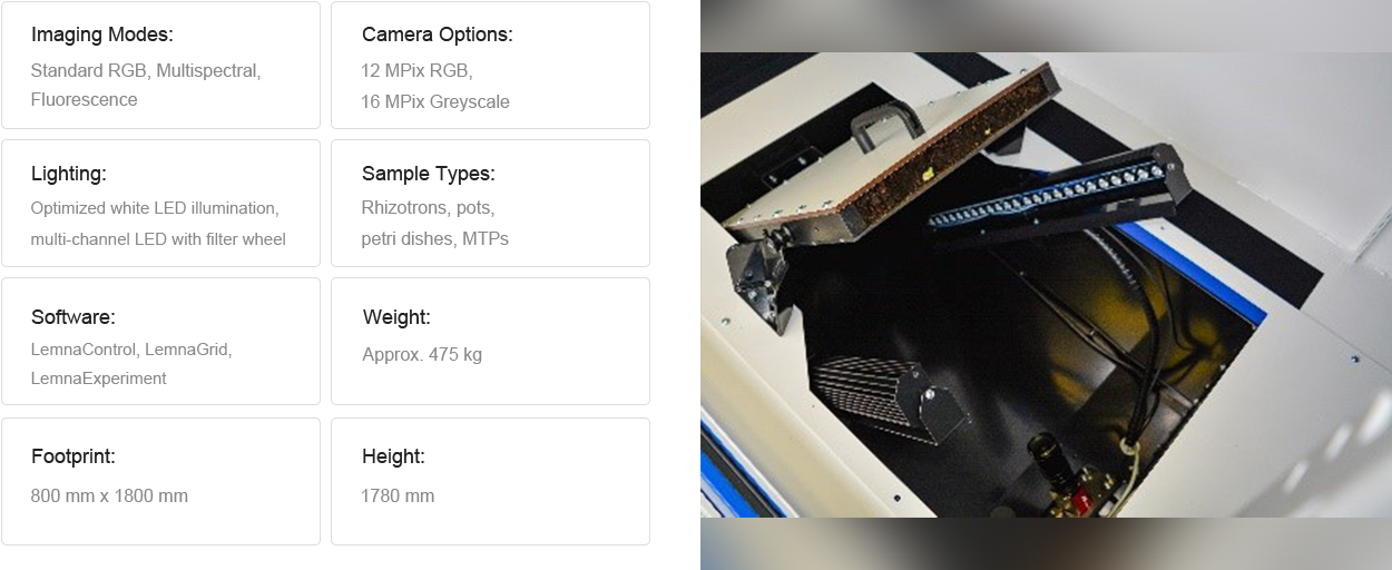 The laboratory phenotyping system is available with industry-grade cameras in horizontal, vertical, and rhizobox-view positions, combined with different lighting and imaging technologies