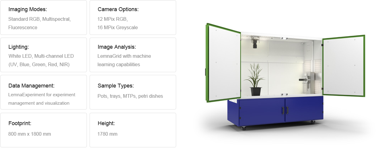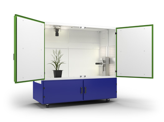 The laboratory phenotyping system is available with industry-grade cameras in horizontal-, vertical-positions, combined with different lighting and imaging technologies.