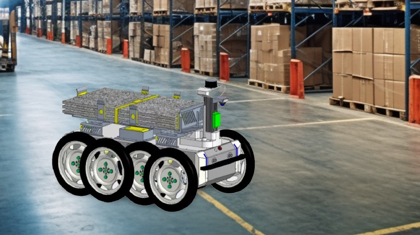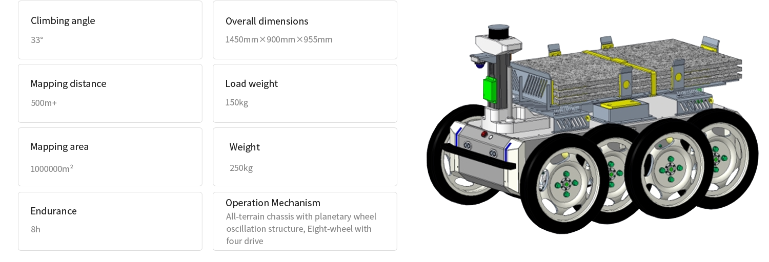 Eight-wheel four-wheel drive planetary swing-arm chassis with strong off-road capability and excellent maneuverability.
