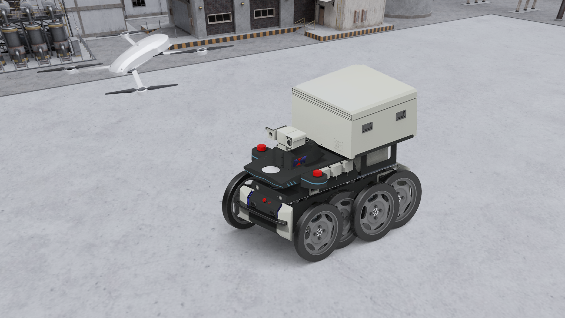 Equipped with a drone, the unmanned vehicle can charge and provide a data link to the drone.