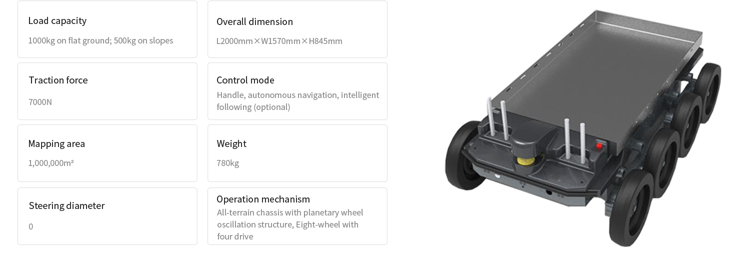 It can easily carry heavy-duty materials to the rescue site, with a load of up to 1000kg on level ground and 500kg on climbing grades.