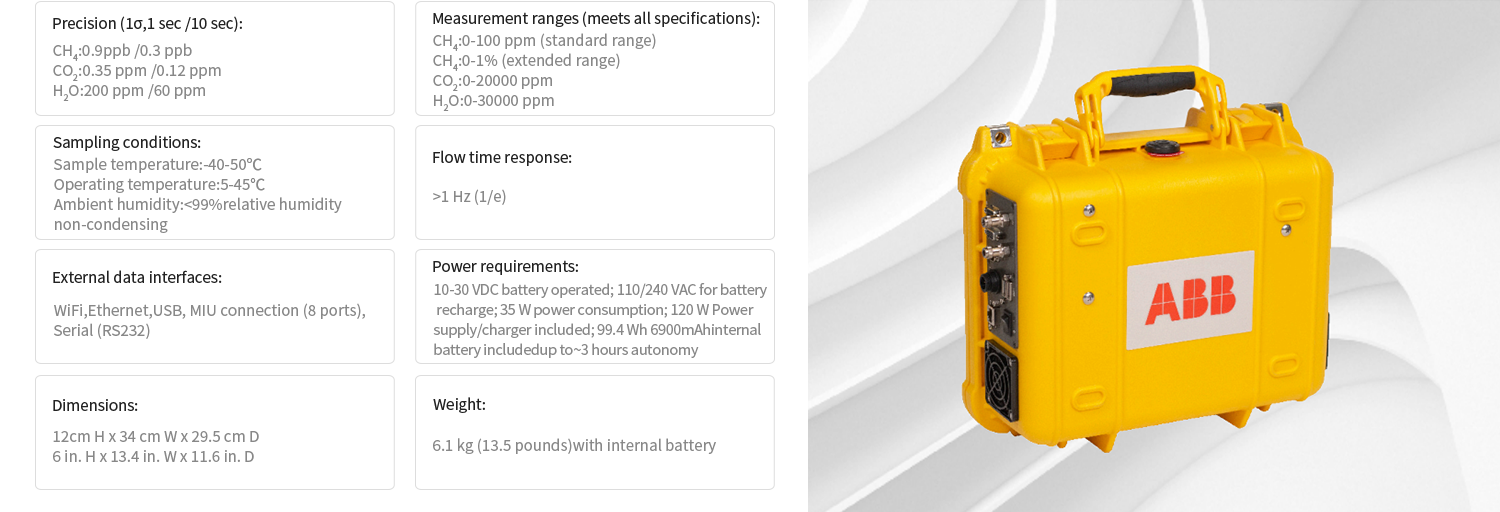 ABB's microportable gas analyzers (GLA131-GGA) reports measurements of methane, carbon dioxide and water vapor simultaneously in a package that is compact, crushproof and travels anywhere. Small enough to be hand-carried (even on-board aircraft) and requiring less than 35 watts, the GLA131-GGA offers opportunities to measure greenhouse gases anywhere.