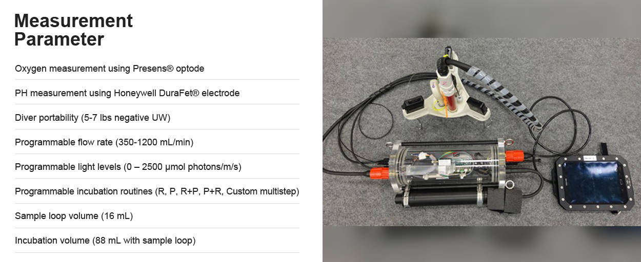 An Incubation Head housing the sensors, pump, LED light source is attached by the user to the coral/substrate surface with special retractors.